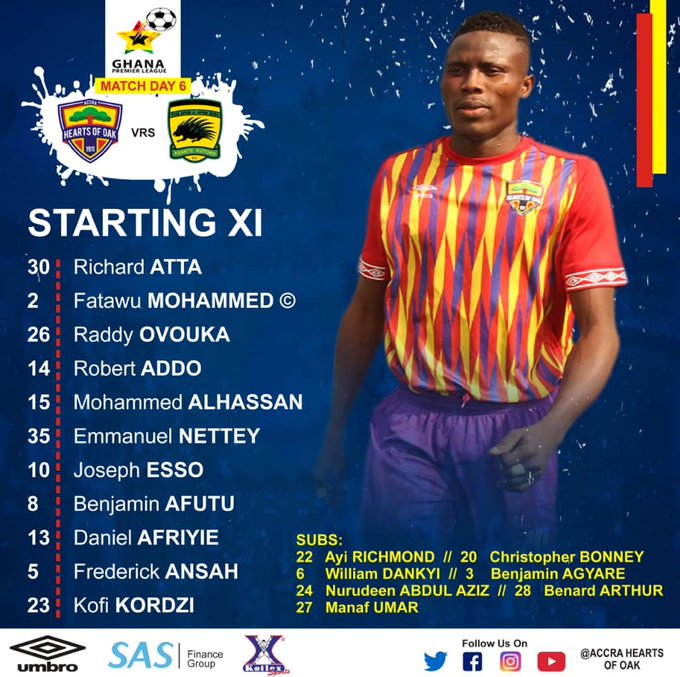 Hearts lineup: Richard Attah (GK) - Abdul Fatawu Mohammed - Robert Addo Sowah - Mohammed Alhassan - Raddy Machel Ovouka - Benjamin Afutu - Emmanuel Nettey - Frederick Ansah Botchwey - Daniel Afriyie Barnieh - Joseph Esso - Kofi Kordzi