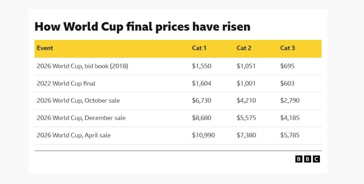 The first open sale of tickets for the 2026 World Cup showed Fifa is charging up to $10,990 (£8,333) to be at the final.