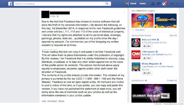 “Due to the fact that Facebook has chosen to involve software that will allow the theft of my personal information, I state: at this date of January 5, 2015, in response to the new guidelines of Facebook, pursuant to articles L.111, 112 and 113 of the code of intellectual property, I declare that my rights are attached to all my personal data drawings, paintings, photos, video, texts etc. published on my profile and my page. For commercial use of the foregoing my written consent is required at all times.