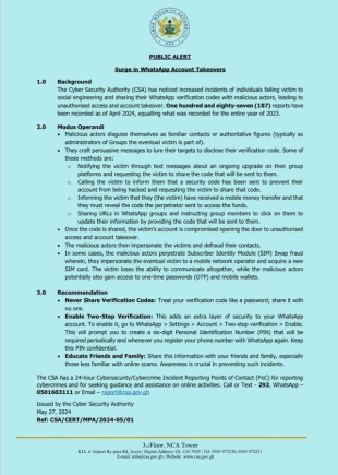 The Cyber Security Authority (SA) has noticed increased incidents of individuals falling victim to social engineering and sharing their WhatsApp verification codes with malicious actors, leading to unauthorised access and account takeover. One hundred and eighty-seven (187) reports have been recorded as of April 2024, equalling what was recorded for the entire year of 2023.
