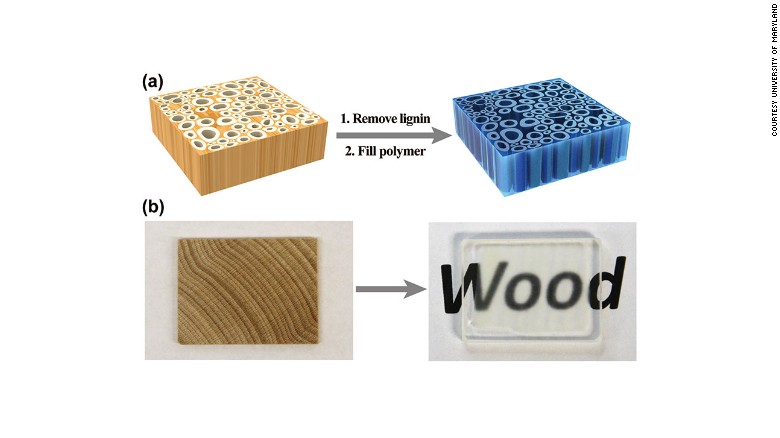 After the color is removed, polymers or epoxies can be injected to strengthen the wood. The result is stronger, transparent wood