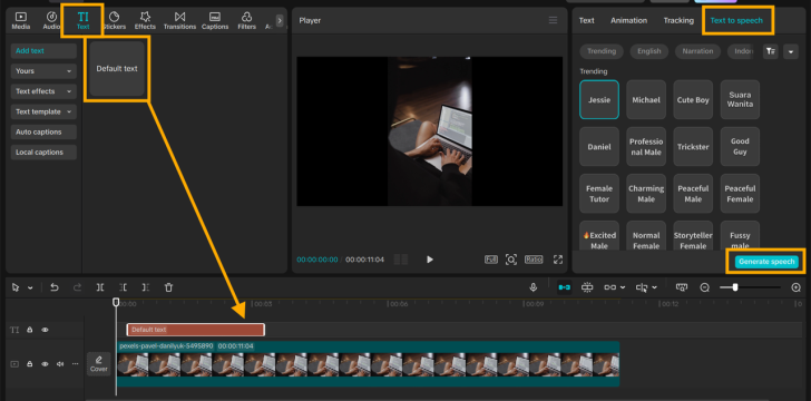 Now, with the text layer selected, look to the right-side menu and click on "Text to speech". Choose your voice, pitch, and language. Then click "Generate speech".